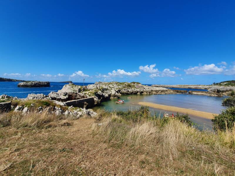 Na een paar kilometer bereiken we het strand van Comillas, waar we vanuit de verte al een rij campers ontwaren. Na wat laveren tussen geparkeerde auto's vinden we een prima plek direct aan het strand. Als ik wat boodschappen heb gedaan en terugkom zie in Marjos op de stoep al geanimeerd met Thole en Everdien kletsen.