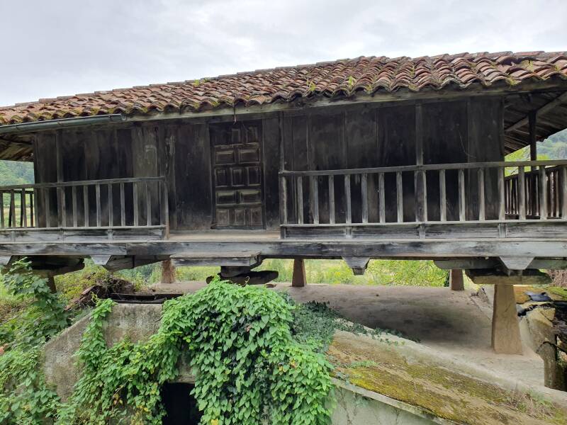 Na de nodige foto's, gaan we over dezelfde binnendoor-sluip-kruip-weggetjes terug naar de grote weg om vervolgens een eindje na Caravia af te slaan, de AS-260 op richting Mirador de Fitu. Dit is een spectaculair hooggelegen uitzichtpunt, niet alleen over de Picos, maar ook over het aangrenzend gebergte en de zee. Daarvoor moet wel veel geklommen worden, dus de weg gaat, af en toe steil, omhoog en omhoog. Onderweg zien we vele oude fotogenieke voorraadschuren op palen (bouw om knaagdieren te weren).