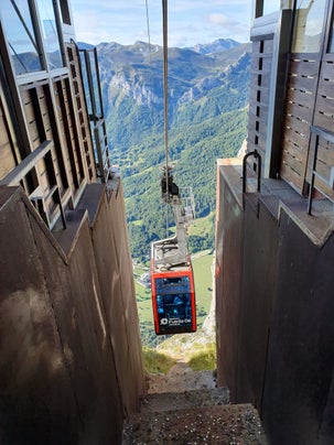 Heerlijk uitgerust gaan we vroeg op pad naar Fuente Dé. De weg gaat aardig omhoog en rond half tien arriveren we op de grote parkeerplaats. Goed is te zien hoe steil het laatste stuk is van de kabelbaan hoog op de bergwand tegenover ons. We lopen naar de entree van de Teleférico, betalen 2 x €15,- retour en gaan na openstelling om 10.03 uur de lucht in. Binnen luttele seconden hangen we honderden metershoge het dal en in 4 minuten arriveert de onbemande cabine met zo'n 20 mensen boven, wat een uitzicht. Het stalen uitstekende uitkijkplateau met het rasterbodem waardoor je een paar honderd meter recht omlaag kijkt ligt er nog steeds.