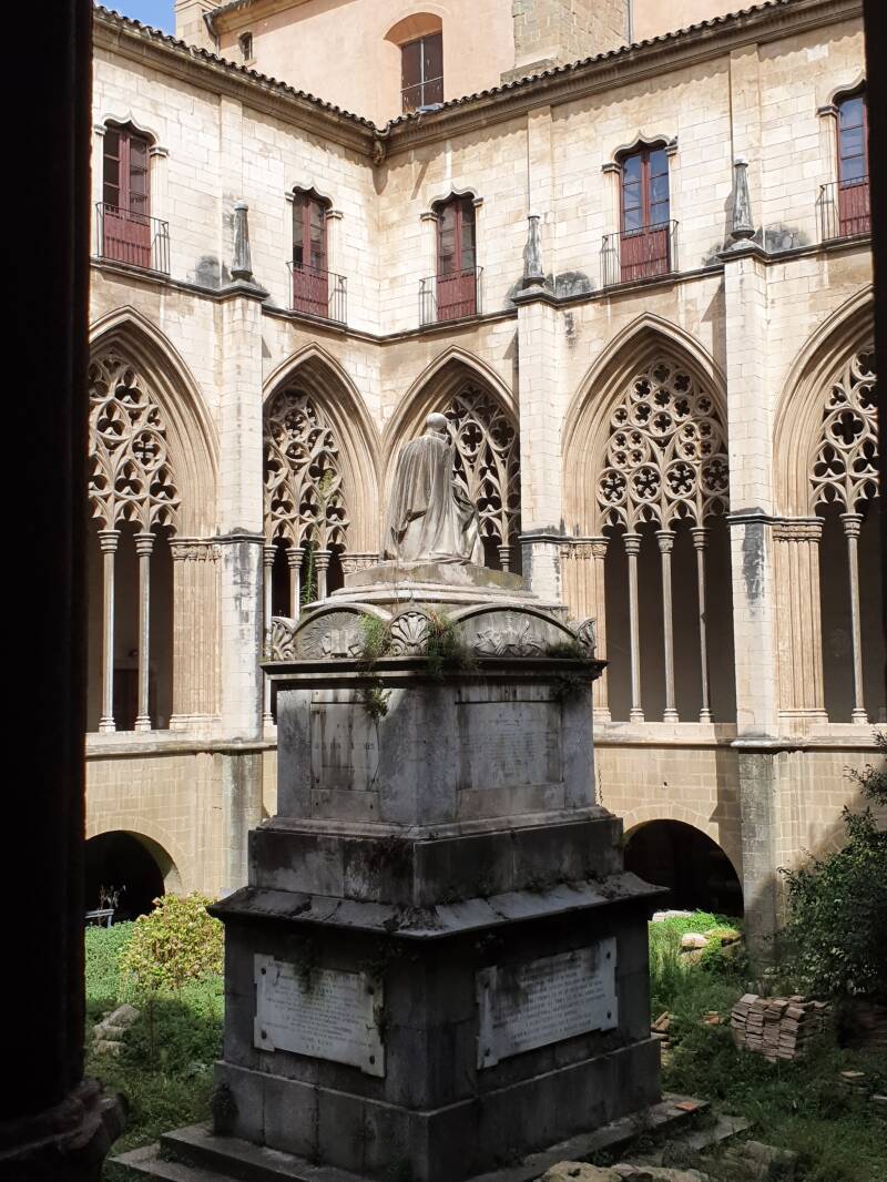 Via het tourist office, nemen we bij de Roman tempel het tweede terrasje van de dag voor een cortado, we hadden al een café con leche op. De Romeinse tempel is fors gerestaureerd en binnen is een kunstexpositie, die ons niet echt kan boeien. Dus op naar de kathedraal. Dat is van buiten een merkwaardig gebouwcomplex, gedeeltelijk heel oud en gedeeltelijk redelijk nieuw. De kathedraal werd gebouwd in de 11e eeuw. Andere elementen, in barokke stijl, werden toegevoegd in de 14e en 15e eeuw, terwijl een groot deel van de rest van het gebouw werd gerenoveerd in de 18e en 19e eeuw en een neoklassieke stijl heeft. Als we erin lopen is het redelijk teleurstellend, het is wel groots in afmetingen, maar heeft een somber Barok interieur, vermixed met 19e eeuwse schilderijen.