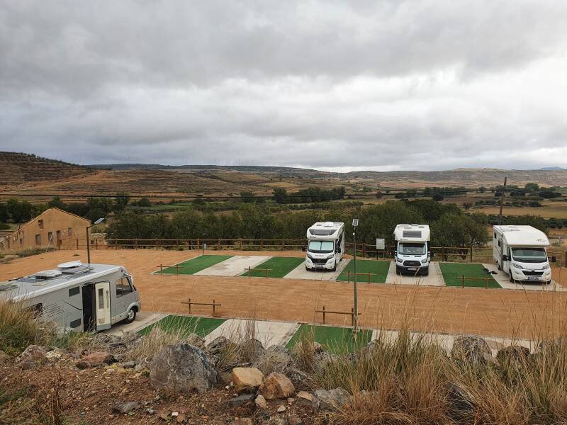 Terug bij de parkeerplaats, besluiten we een overnachtingplek te zoeken, niet ver van hier. Eerst naar een olijfboomgaard, dat ziet er op de plaatjes leuk uit. Daar aangekomen om half 5, is het toch wel redelijk saai in je uppie en bovendien in de volle zon is het wat warm.. We zoeken een andere CP op, 10 kilometer verder in Trasmoz. We bereiken via prachtige dorpjes en stadjes in het Moncayogebied de gloednieuwe CP in Trasmoz, fantastisch aangelegd; gratis met voorzieningen. Tot onze verrassing zien we de camper van Thole en Everdien staan. Na een hartelijke begroeting besluiten we samen een aperatiefje te pakken, die naderhand aangevuld door sushi, worst en kaas tot een drink- en eetfestijn wordt uitgebreid. Gezelligheid kent geen tijd en pas rond half 11 is het genoeg; het is inmiddels aardig afgekoeld. Wat een bijzondere dag weer!!