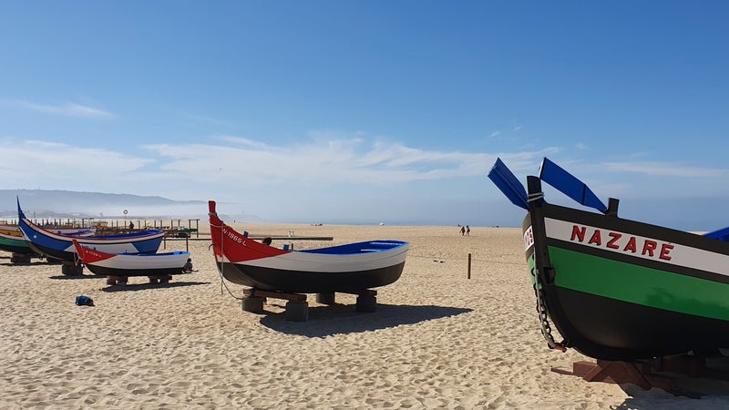 Vanmorgen op tijd opgestaan; we hebben nog wat oud brood om te grillen, maar de voedselvoorraad begint aardig op te raken. We gaan dan ook na het ontbijt op de scooter eerst wat inslaan bij de Lidl. Daarna door naar Nazaré Boulevard, waar we de zee in een dikke mist gehuld vinden. Het is zondag en een drukte van jewelste op de boulevard. Een aaneenschakeling van (souvenirs)winkeltjes afgewisseld met eettentjes en terrasjes. We parkeren de scooter en lopen een paar winkeltjes in, niet echt veel bijzonders. Op een terrasje nemen we koffie en een tosti en dan gaat André terug naar de camping om de F1race te kijken; Marjos blijft op het strand om daar te gaan lezen. Als André bij de camper aankomt, is de race al een uur bezig... oeps even vergeten dat in Portugese tijd de wedstrijd een uur eerder aanvangt. Max Verstappen eindigt als 2e en loopt weer 6 punten uit op Hamilton (die als 5e eindigt). Ondertussen vermaakt Marjos zich uitstekend, het is echt heerlijk op het strand, totaal niet druk als je het vergelijkt met de boulevard. Na de race komt André weer met de scooter naar het centrum. Het is daar nog drukker dan vanmorgen, hebben we geen zin in en we gaan dan ook terug naar de camping.