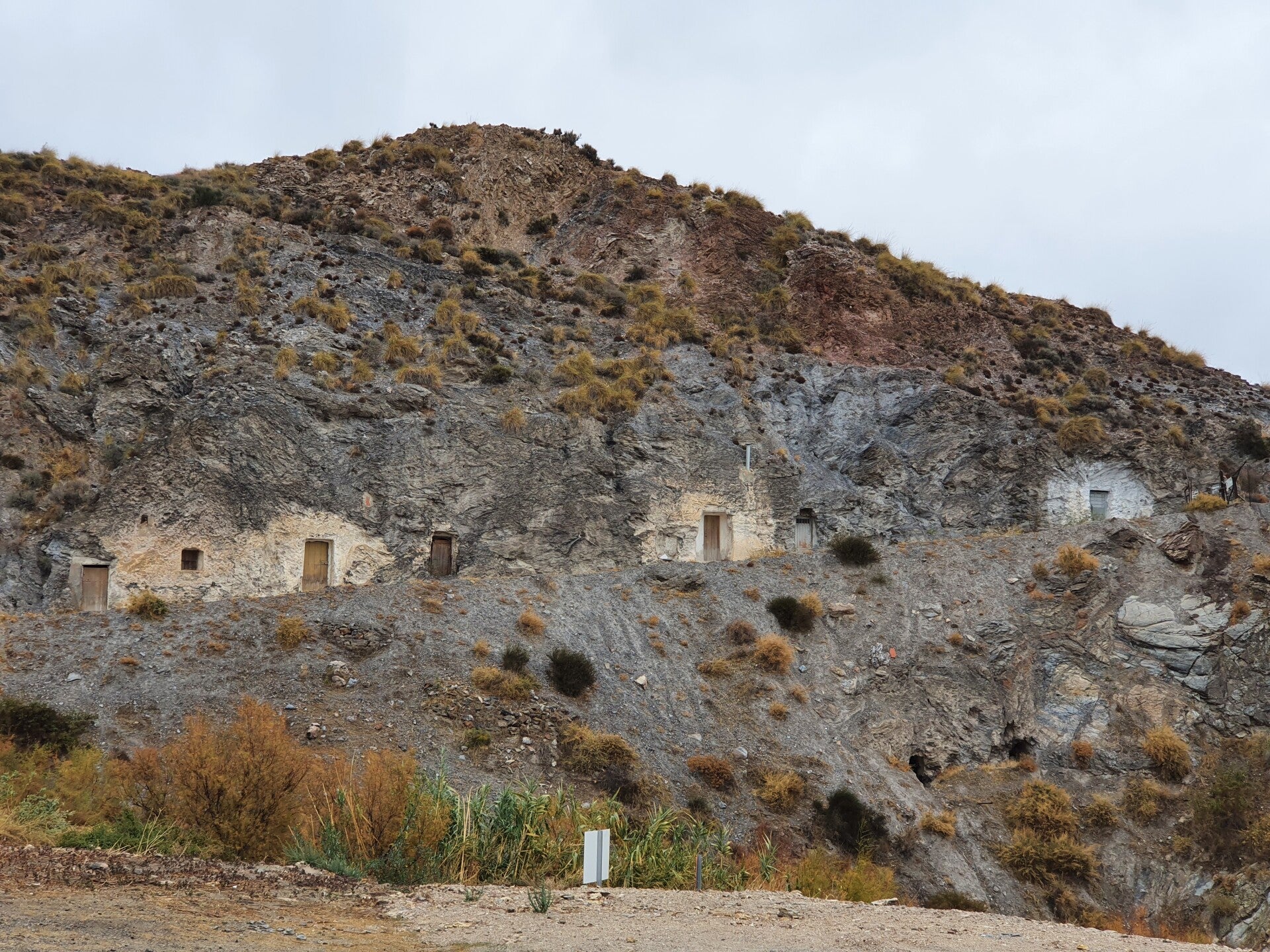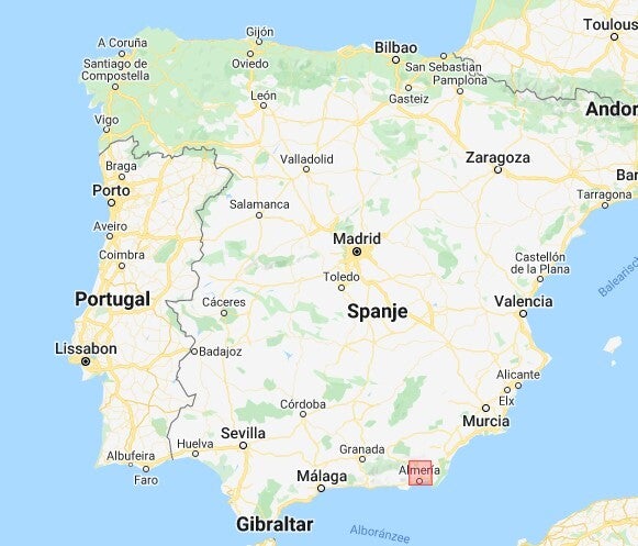 We blijven de mooie bergachtige kustroute volgen en wat opvalt is dat het leisteen van deze bergen gitzwart is en glimt, het lijkt wel steenkool. Na Mojacar besluiten we vlak voor Carboneras ons nachtkampement op te slaan. Een verharde plek direct aan zee met als buren een Duitse Morelo en Concorde camper. Met een toenemende wind, staat de camper op een gegeven moment steeds harder te schudden en besluiten we door te rijden naar Almeria via de snelweg. Het eerste gedeelte gaat door het Parque Nacional Cabo de Gata. Echter verderop bij Nirjas, loopt de route door de immense plastic tuinteelt die zich hier ver rond Almeria uitstrekt.