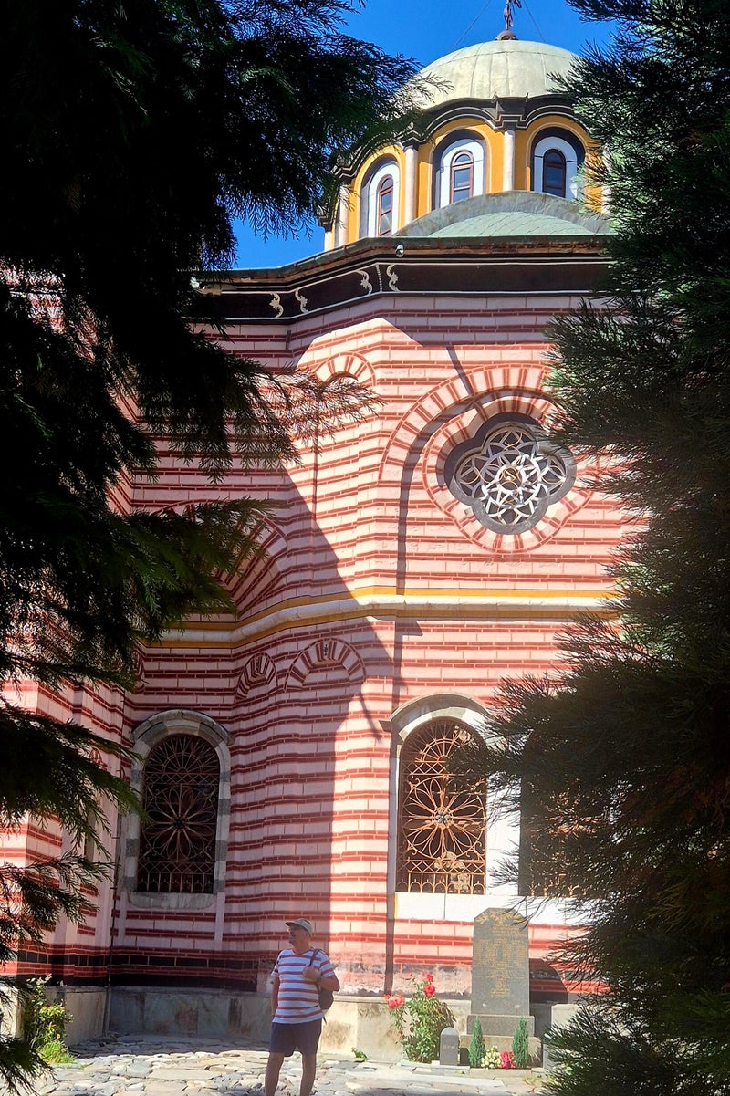We rijden tot vlak voor de poort van het 1300 meter hoog gelegen klooster. Daar vinden we een gaatje op de drukke dure parkeerplaats (10 euro!), stappen door de poort naar binnen en zijn gelijk gevangen door het fenomenale uitzicht. Prachtig zoals de kloostergebouwen het centrale kerkgebouw omringen met op de achtergrond het hoge Rila-gebergte. De fresco's op de buitenkant van het kerkgebouw zijn werkelijk adembenemend mooi, zelden zo iets fraais gezien, wow!