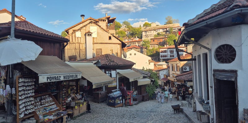 De laatste 60 kilometer voert dieper het binnenland in, waar we de loop van een rivier in een kloof volgen. Vlak na Karabük arriveren we op Camping Çadir en hebben volop keus in beschikbare plaatsen met slechts één andere camper en caravan. We hobbelen via een smal straatje over de keitjes naar het oude centrum van Safranbolu. Het stadje bekend om de saffraan staat op de Werelderfgoedlijst van Unesco vanwege haar bijzondere architectuur. Het lag aan belangrijke handelsroutes naar het Verre Oosten, zoals de Zijderoute. De Konaks, oude Osmaanse huizen van steen en hout werden door rijke kooplieden gebouwd liggen in een doolhof van straatjes en op de hellingen omhoog. De huizen met hun geometrisch vensters hebben veel weg van de oude Ottomaanse huizen die we 2023 zagen in Albanië, in Berat de stad van duizend vensters.