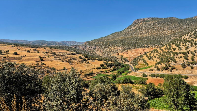 Na Sügür verlaten we de hoofdweg en draaien we de bergen in over een smalle binnenweg. Het voelt alsof we in een ander Turkije belanden: dorpjes liggen verspreid tussen de velden met tabaksplanten, waar hier en daar mensen bezig zijn met de oogst. Grote bladeren hangen te drogen op houten rekken en het frisse groen van de velden vormt een mooi contrast met de meer kale berghellingen.