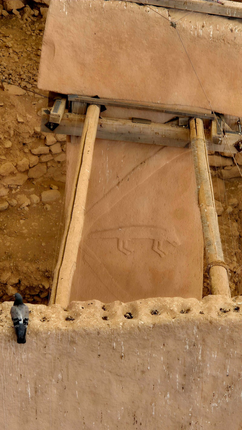 Dan wordt de omgeving kaler, bewoning en planten verdwijnen en komt Karahantepe in zicht, met bovenop de heuvel gelegen de opgraving. Dit is het oudste bekende tempelcomplex ter wereld, zelfs ouder dan Göbeklitepe. Het dateert uit het Meso-Neolithicum, rond 10.000 v.Chr. – de tijd van jagers-verzamelaars, zonder schrift en zonder keramiek. Wat we zien zijn diepe ronde putten met stenen wanden, monolithische pilaren en soms versieringen van dieren en symbolen. Het voelt alsof we een eerste stap naar georganiseerde samenlevingen en religie voor ons zien. Op toeristengebied is het maagdelijk, slechts één ander zien we bij aankomst. Naast archeologen en lokale werkers, zijn er alleen buitenlandse wetenschappers die gewapend met notitieblokken op de site lopen. Op wel twintig plekken wordt met borstels en troffels gewerkt. Het stof kringelt omhoog en je loopt er gewoon tussen door smalle paadjes langs de kuilen. Foto’s maken mag eigenlijk niet ; op sommige plekken is de toegang zelfs helemaal afgesloten geven geüniformeerde bewakers duidelijk aan.
