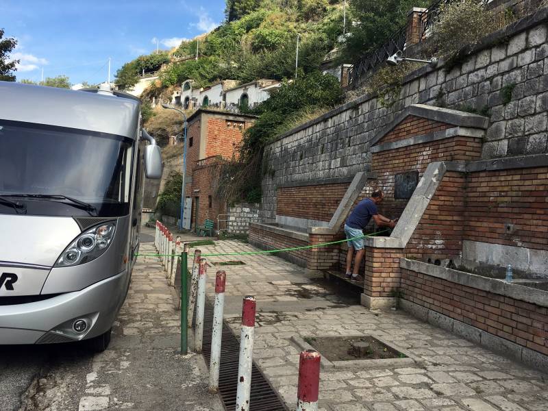 Onderweg tussen Lavello en Rapolla, blijkt het stuwmeer vermeld op zowel kaart als ook op de Navi, niet meer te bestaan, bizar! In plaats van een mooi blauw meer, zien we alleen maar groen struikgewas. Vlak voor Rapolla, tanken we schoon water af met het bronwater, wat uit tappunten vloeit aan de zijkant van de weg. Heerlijk dit water uit de bergen. Talloze mensen stoppen hier om flessen te vullen. Hier is het gratis en voor niets, een paar kilometer verderop staat een grote fabrieksinstallatie van Leggera, die het mineraalwater in flessen verwerkt, voor verkoop aan winkelketens.