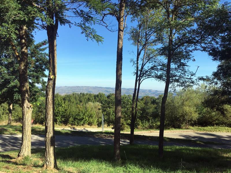 Allengs laten we steeds meer het hogere berglandschap achter ons, het wordt allemaal wat vlakker. Vlak voor de middag zien we in de verte een constructie boven de bomen opdoemen, die doet denken aan een cluster reuze graansilo’s. Het plaatje in gedachte zeg ik tegen Marjos dat ik denk dat dat Castel del Monte moet zijn en zij reageert met ongeloof. Het ziet er dan ook zo-niet-kasteel-achtig uit. Naderbij gekomen blijkt dit witte legoblok inderdaad toch onze bestemming te zijn.
