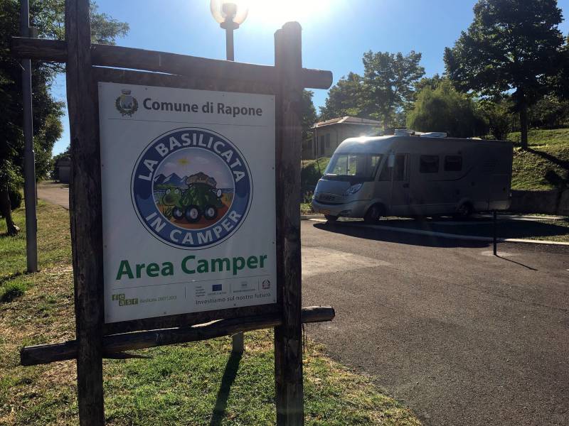 Rond 19.00 uur gaan we onderweg naar het 25 km verderop gelegen Rapone, waar een gratis Sosta CP is, met alle faciliteiten. Om half acht bereiken we, in de schemering, de prachtige CP en slaan ons kamp op. Met de enorme restanten van de lunch, aangevuld met wat kaas en salami uit Norcia en een wijntje, zetten we ons neer voor het journaal en de wekelijkse serie Ollolai. Daarna is het kaarsje op en gaan we heerlijk slapen.