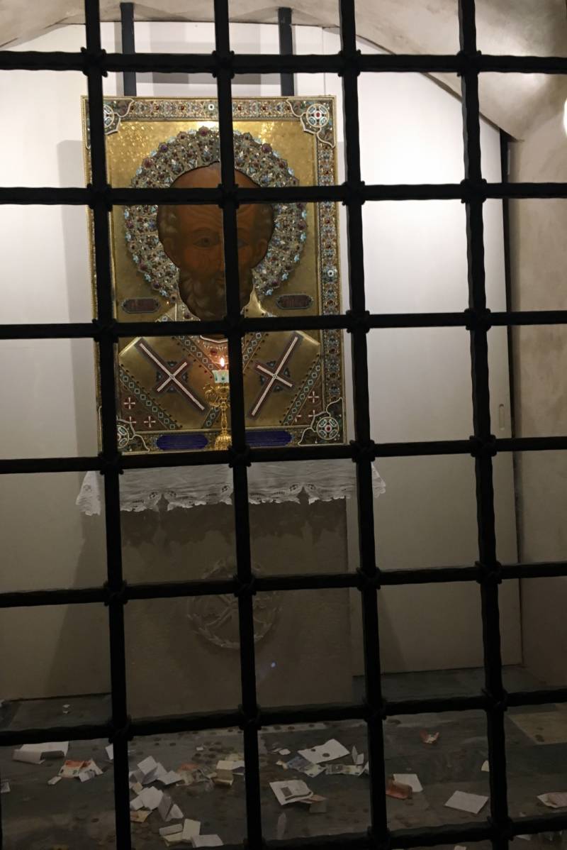 De temperatuur is inmiddels cooking hot, hot en nog eens hot. Kalmpjes aan de oude stad ingelopen en prompt op de oude kathedraal gestuit. Afgezien van de trouwerij die daar ging starten en altijd leuk om te zien, is de hoofdattractie toch wel St. Nicolas, ja onze bekende Sinterklaas, die hier in de kerk begraven is. En voor de duidelijkheid, hij komt uit Myra (Turkije) en derhalve voorzien van een bruin/zwart uiterlijk. Gezien de hele discussie in Nederland, best wel verhelderend voor sommige politieke partijen en hun geloofsgenoten. Deze heilige is niet alleen belangrijk voor de katholieke, maar ook voor de Grieks-orthodoxe kerk. We zien talloze herkenbaar orthodoxe gelovigen rondlopen. Niet alleen de beeltenissen boven, maar ook de tombe van Nicolas in de crypte van de kerk, zijn debet voor de vele pelgrims.