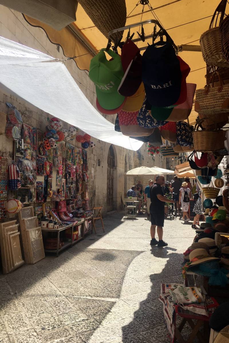 Vanmorgen vroeg uit de veren, wat gegeten, dagboekje bijgewerkt en nagedacht over de komende route. Het geluid van mijn eerste stappen buiten is een lokroep voor de talloze honden die hier rondzwerven en ze spurten op mij af. Ik maan ze tot stilte en wijs ze op hun plaats als ze tegen mij ‘aanrijden’ , daar ben ik niet van gediend; ze druipen langzaam af. Nadat alle ochtendrituelen zijn ingevuld, nemen we afscheid van onze spontane medereisgenoten voor 1 dag. Zij gaan richting grotten en Alberobello en wij gaan vooralsnog een andere kant uit. We knuffelen goodbye en spreken af elkaar op de hoogte te houden van onze avonturen. Wij gaan richting Ruvo di Puglia, maar al snel wordt duidelijk dat we niet meer precies weten waarom, haha. Waarschijnlijk hadden we gisteren hier een overnachting gepland. Via de schitterende en eeuwenoude olijfboomgaarden van Bitonto, over onmogelijk smalle weggetjes, belanden we voor het middaguur in Bari en daar parkeren we bij de haven in de oude stad.