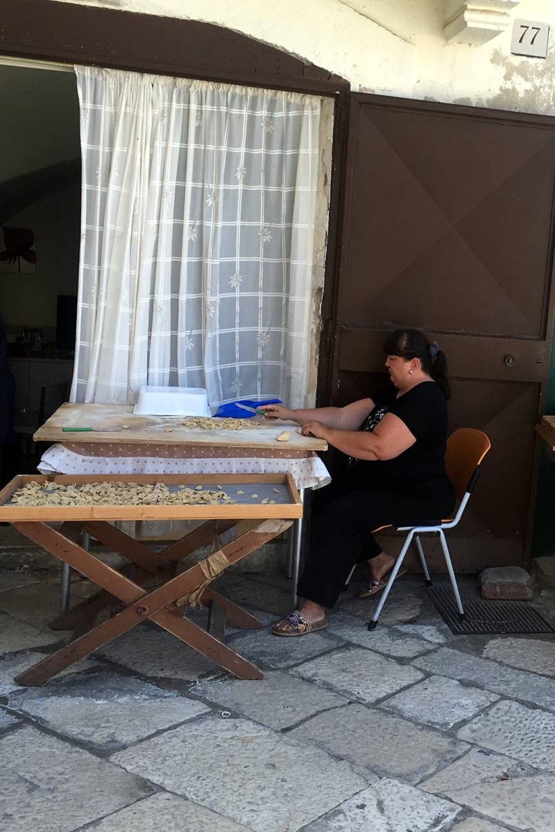 We lopen wat verder rond en via de oude Svevo burcht, belanden we in het zogenaamde pasta-straatje. Hier zijn veel vrouwen bezig met het vervaardigen van oricchieti, de ‘oortjes’-pasta. Sommigen vrouwen produceren in staccato-tempo, enorme hoeveelheden in no time. Voor de lunch duiken we op een terrasje en nemen het dagmenu. Voor €11 de man hebben we oricchiete Barinese vooraf, gevolgd door een uitstekende hamburger en na koffie met water, een koopje. Smaakte allemaal heerlijk en het geeft ons voldoende energie om weer verder te gaan in de hitte van inmiddels 39 graden.