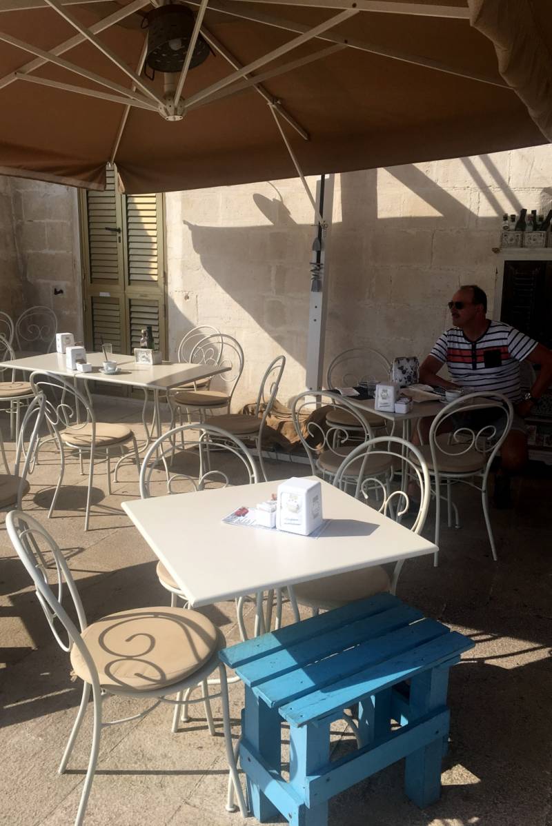 Als we bij een kruidenier om brood vragen, ziet de man zijn kans schoon om wat extra te verdienen en belegt weldadig het in stukken gesneden, Italiaanse plattebrood. Gedroogde ham, Pugliakaas, buffelmozzerella, tomaatjes, gegrilde aubergine, ingemaakte uitjes, champignons, artisjokken, radijsjes, alles komt erop. Hij doet er vervolgens een bakje olijven en doosje druiven bij, k’tjing kassa, “€20,- per favore”. Tegen zo’n goocheltruc hebben wij weinig verweer en we lopen likkebaardend de toko uit.