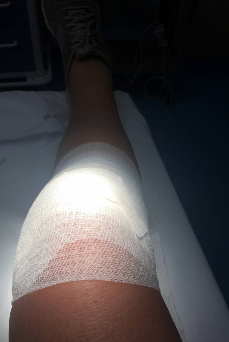 Bij de eerste hulp in de wachtkamer is het wachten, wachten en geduld hebben. Om 4 uur, ruim drieënhalf uur na het voorval, ben ik het zat en zeg tegen de vrouw aan de balie dat de wond redelijk ernstig is en directe behandeling behoeft. Dit helpt en Marjos wordt snel daarna geholpen. Na 20 minuten komt ze bleek terug met de knie keurig in verband en mompelt dat ze hier asap weg wil.