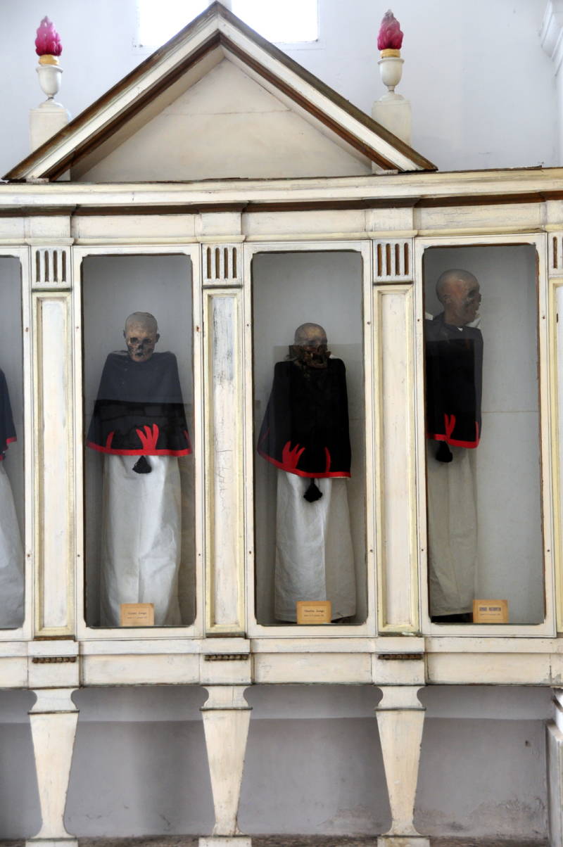 Daarna de oude stad in. We stuiten op Chieso Purgeria, de kerk van het hellevuur. Het interieur is mooi, maar de verrassing staat in de zijruimte. Daar staan in vol ornaat zo'n 12-tal mummies van de pastores tussen 1730 en 1850 van deze kerk achter glas opgesteld. Ook aan de wand, in een kleine glazen vitrine, de mummie van een heel klein kind, een meisje. Een beetje luguber en macaber is het allemaal wel, ofschoon we ons realiseren dat we dit gebruik eerder hebben gezien op Sicilië.
