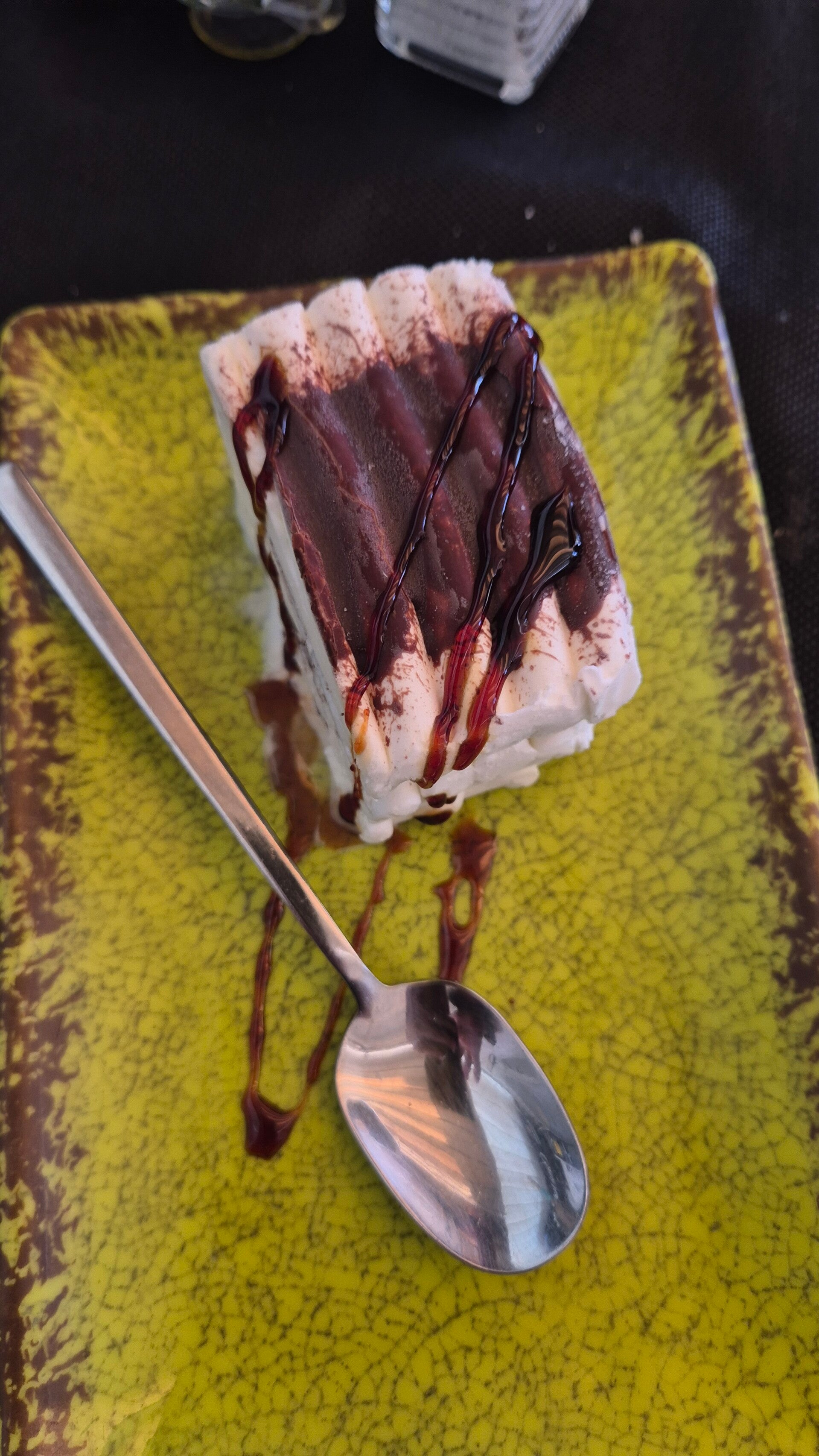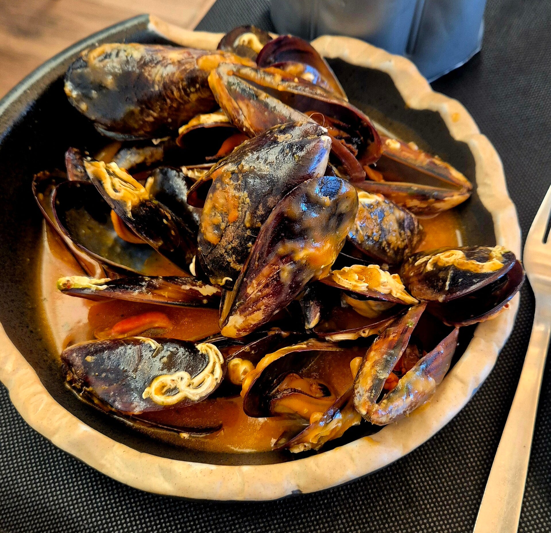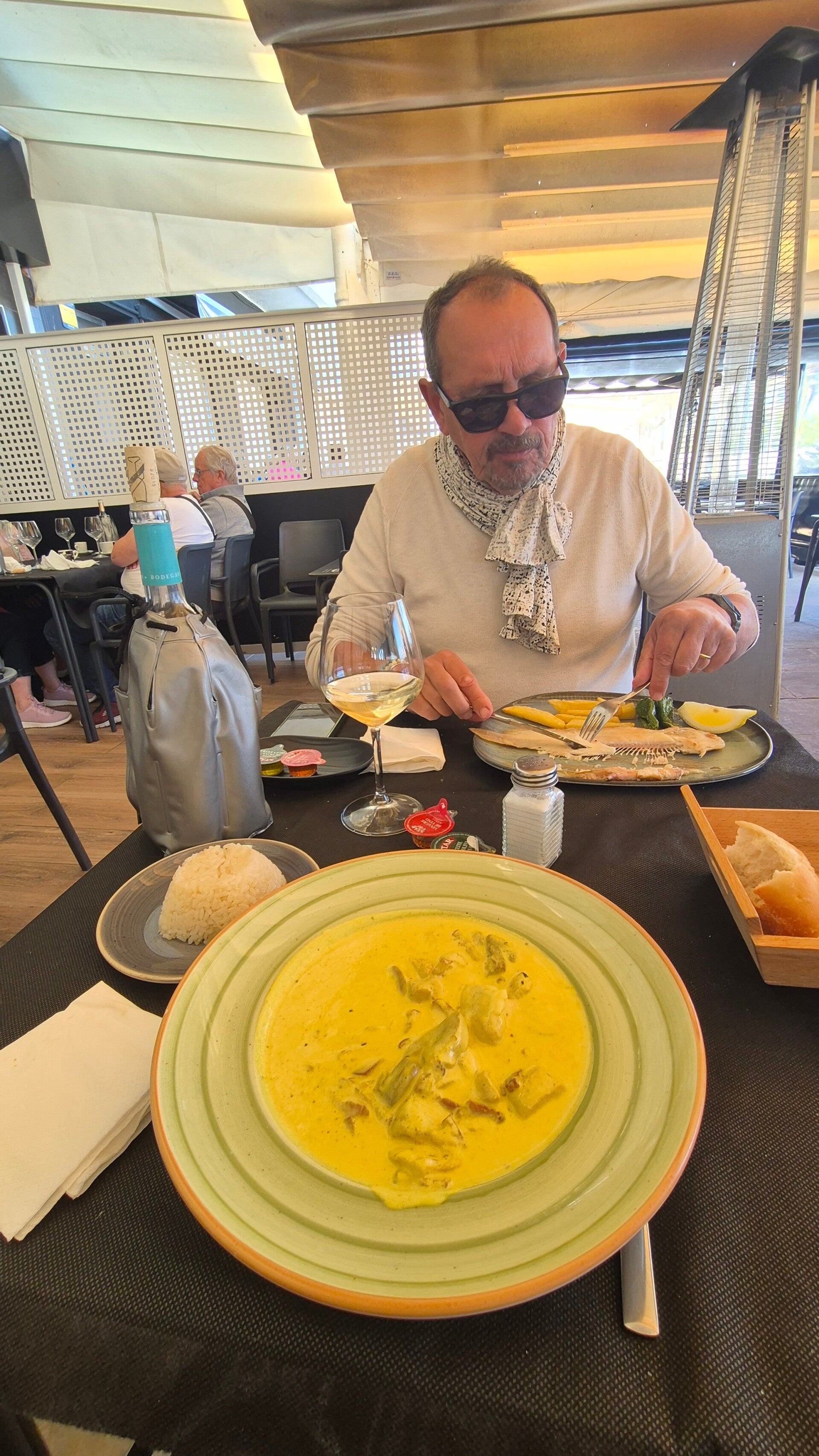 Tussen de gezellige drukte vinden we nog net een tafeltje en worden vlot geholpen. Marjos kiest voor mosselen vooraf, ik ga voor een smakelijke Arroz Negro met zeevruchten. Daarna volgen een romige kipcurry en een perfect gegrilde tong met frietjes. Zoals gewoonlijk verwisselen we nogal eens van bord zodat we beiden van al dat moois kunnen genieten. De porties daarentegen lijken eerder bedoeld voor een hongerig bouwvakkers dan voor twee levensgenieters van onze leeftijdscategorie. Het is simpelweg te veel. Het bescheiden ijsdessert vormt een welkome lichte afsluiting en een cortado past er gelukkig ook nog net bij.