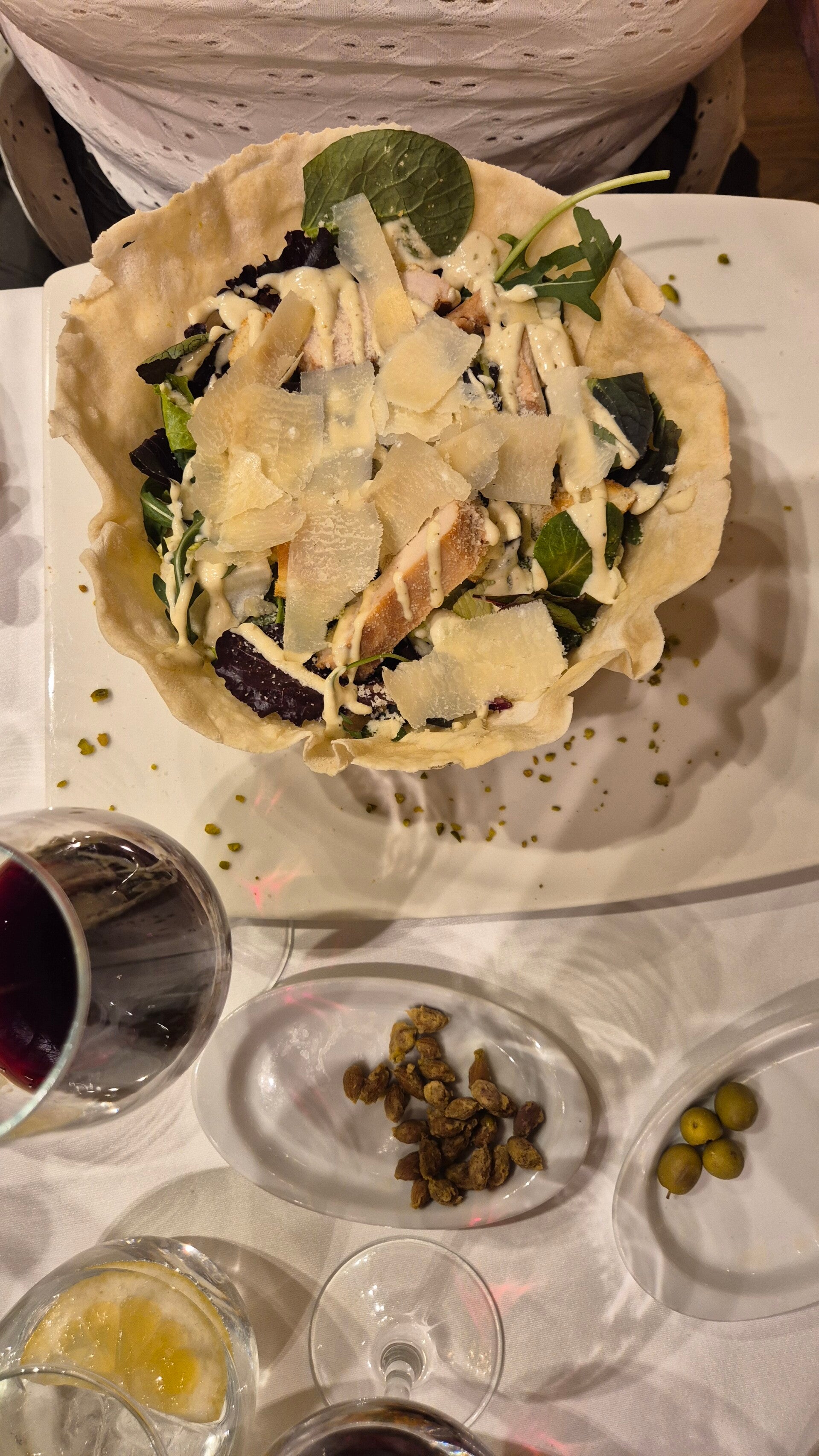 Uit eten kan hier prima, dus schuiven we aan bij La Tagliatelle, een prima Italiaan. Ik ga voor hun pasta-naamgenoot met zeevruchten-bolognese, zalig en Marjos kiest een prachtige Caesar salade. Met een goed glas wijn, wat water, koffie en een gedeeld dessert is de innerlijke mens weer volledig tevreden gesteld.
