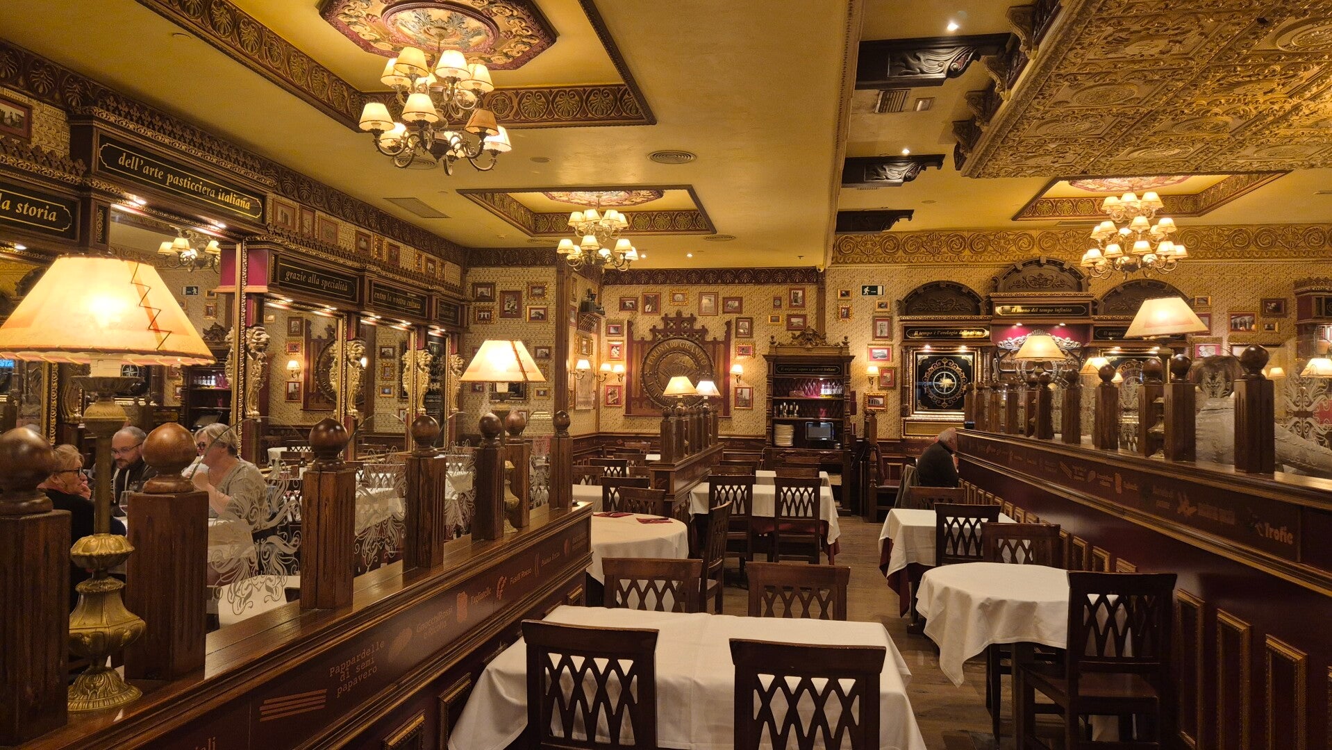 We strijken neer op een terras in het bleke zonlicht bij een koffiebar in het Casino Primitivo, een gebouw in dezelfde sierlijke stijl.