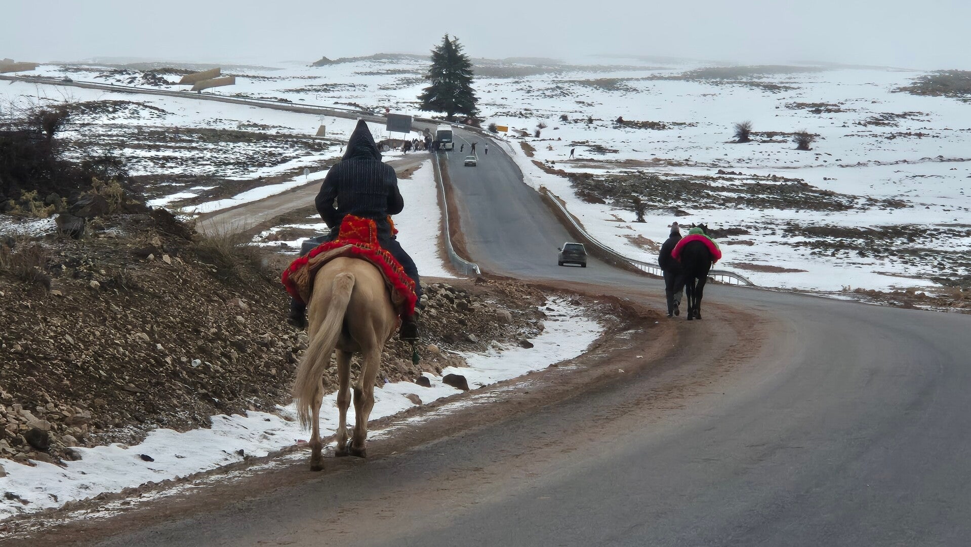 Het is bepaald niet het beeld wat de meeste mensen van Marokko hebben. Honderden volledig bemutste en ingepakte Marokkanen die op de besneeuwde hellingen op een hoogte van 1900 meter pal naast de weg gillend en joelend met een slee omlaag suizen. Niet dat we heel ver de hellingen op kunnen kijken daarvoor is het te mistig, maar het moeten er echt veel zijn die hier plezier aan hebben. Op de tjokvolle tijdelijke parkeerplaatsen naast de weg staan auto's, busjes, zelfs touringcars. Politie probeert enigszins orde in de chaos te scheppen door langsrijdend verkeer te manen verder te gaan. Overigens komt gedurende het merendeel van de rit vandaag de temperatuur nauwelijks boven het vriespunt.