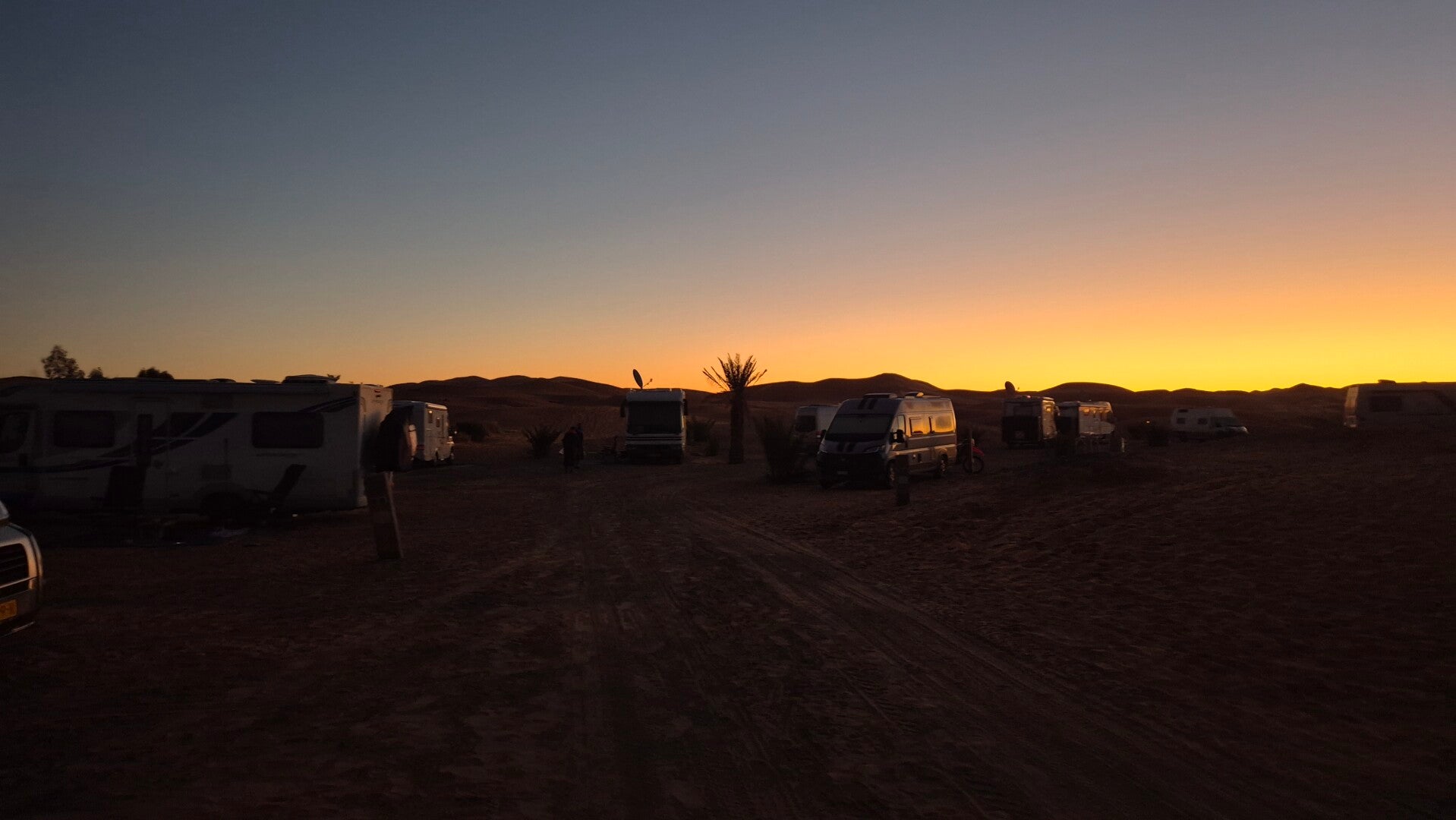 In Merzouga slaan we nog wat groente, fruit en water in, voordat we de ons bekende camping Haven La Change oprijden. Naast Kees en Trui is een plekje vrij, niet ver van het diepste punt wat vol staat. Rondom ons heen ligt de Erg Chebbi, de zandduinen aan de rand van de Sahara, prachtig. Marjos kruipt weer even onder de wol. Na aanmelding bij de receptie, versnij ik wat groenten om een soepje te koken voor mijn zieke eega. Voorzichtigjes gaat er een half kommetje naar binnen en wat thee. Na ook nog een half banaantje zoekt ze het bed weer op. Het houdt allemaal nog niet over. Hopelijk gaat het morgen wat beter.