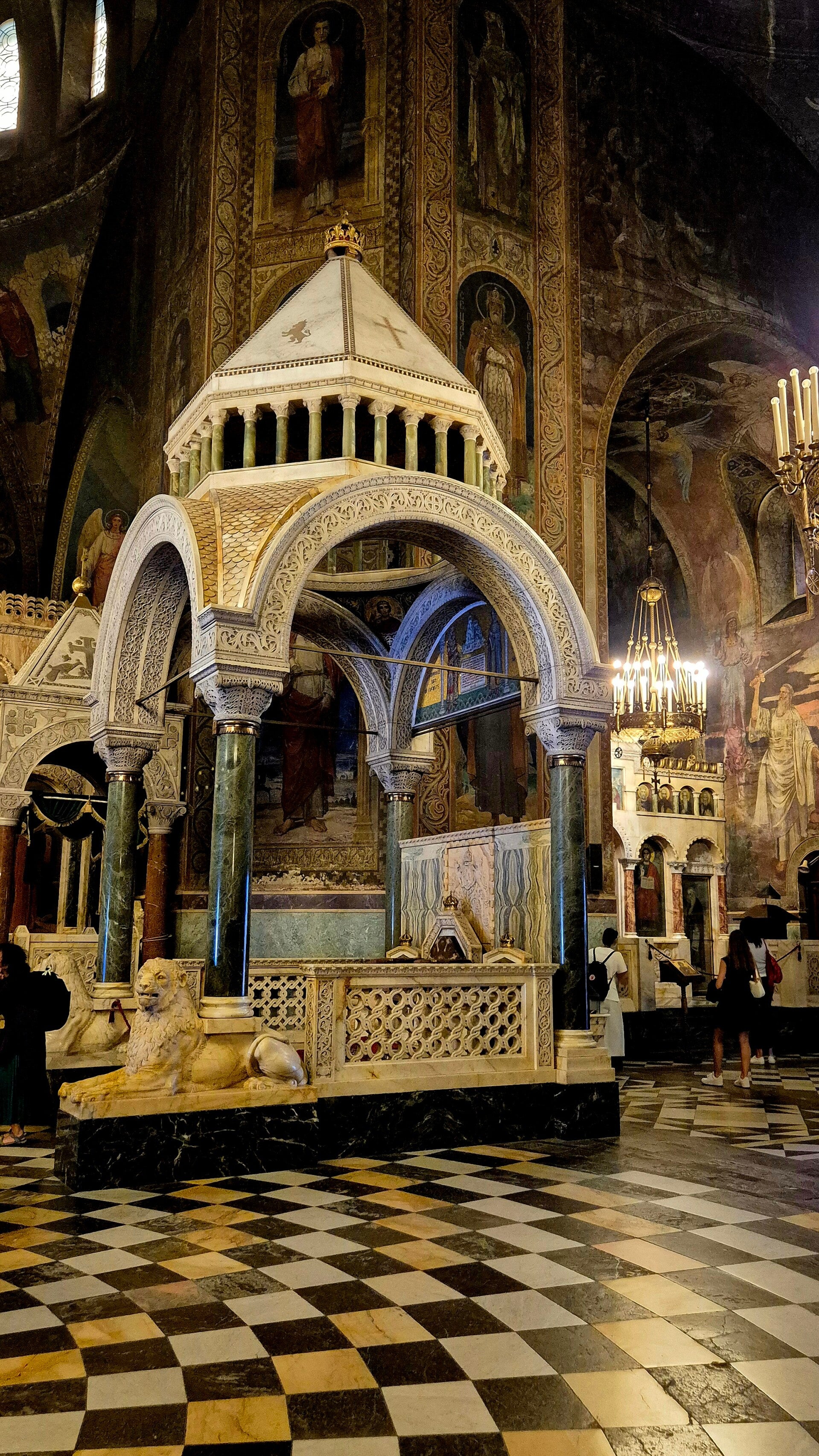 We nemen rustig de tijd om alles goed te bekijken en maken (te) veel foto's 😂. Ook het intieme interieur is schitterend. Prachtige fresco's worden afgewisseld met hoge vergulde wandstukken, hoge kroonluchters, kaarsenstaanders.