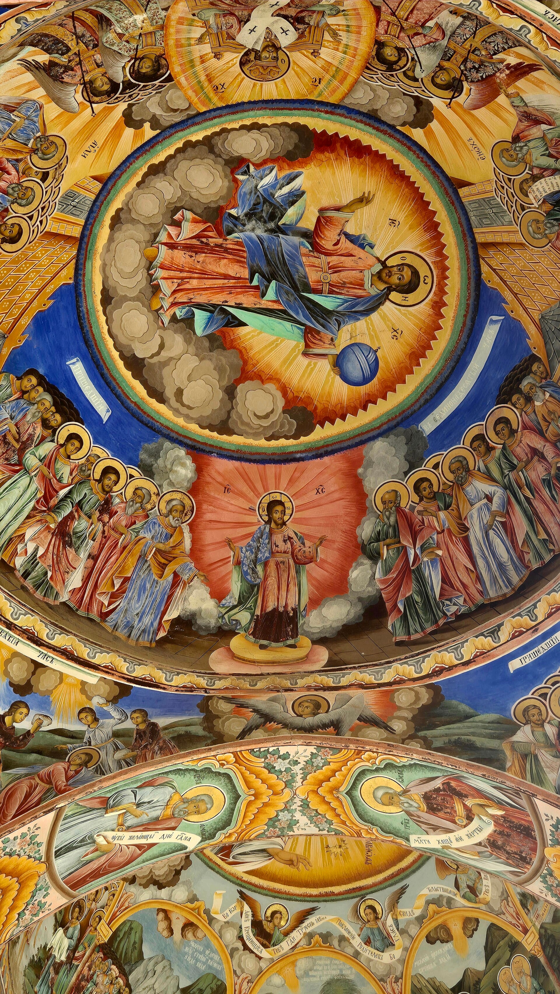 Binnen in de kerk zijn de muren rijkelijk versierd met fresco's, al oogt het geheel toch wat kaal zonder banken of ander meubilair. Aan de zijkanten staan afbeeldingen van heiligen achter glas. Mensen schuifelen eerbiedig langs, kussen de afbeeldingen en bidden - devotie ten top. Een bebaarde priester met hoge zwarte cilindervormige hoed, haar in knot en getooid in lang zwart gewaad wandelt rond. Om hem heen zwermt een groep gelovigen en bij een afbeelding heffen allen een kerkelijk lied aan, wat gezien de geweldige akoestiek nog niet zo verkeerd klinkt.