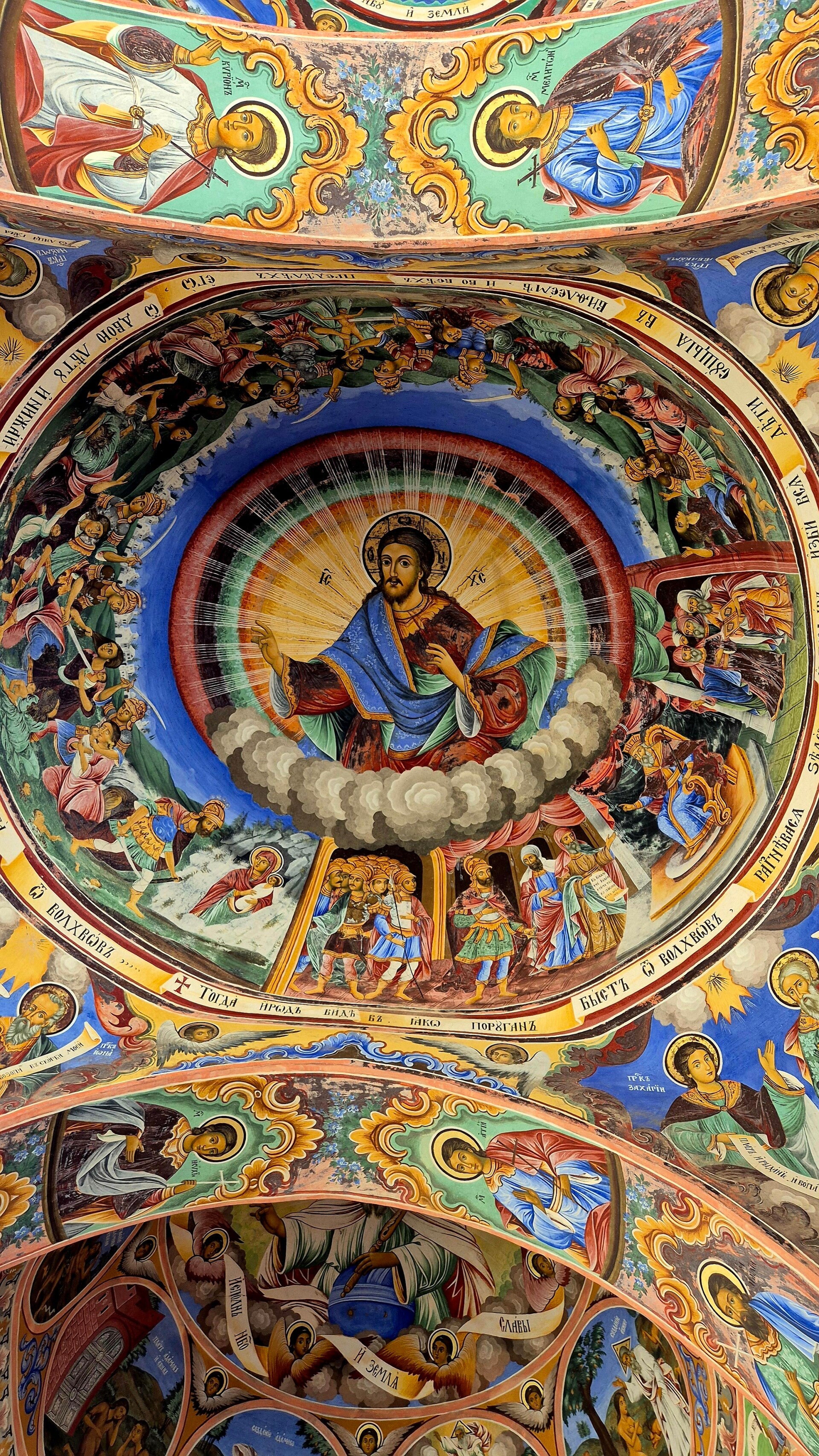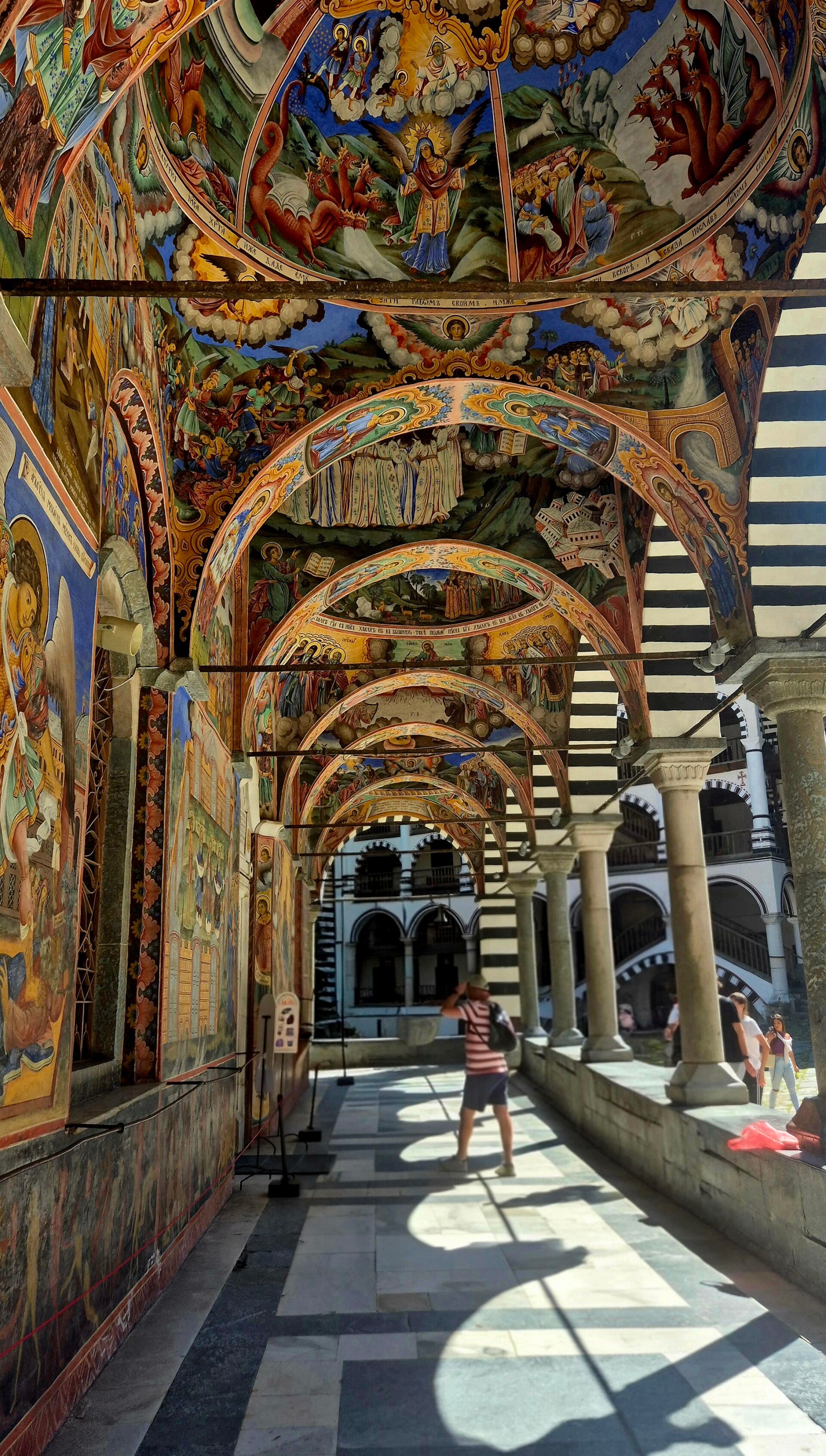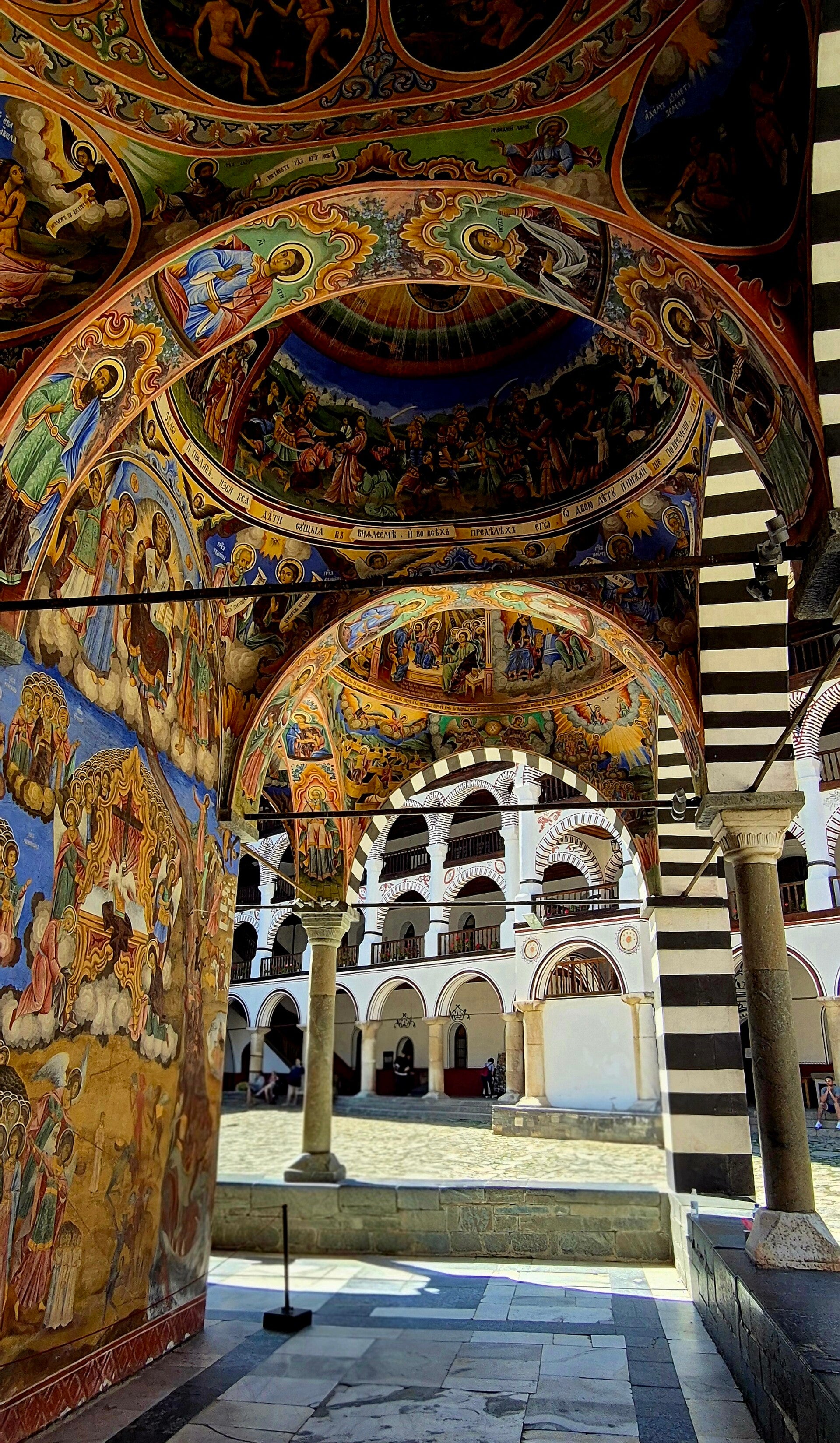 We rijden tot vlak voor de poort van het 1300 meter hoog gelegen klooster. Daar vinden we een gaatje op de drukke dure parkeerplaats (10 euro!), stappen door de poort naar binnen en zijn gelijk gevangen door het fenomenale uitzicht. Prachtig zoals de kloostergebouwen het centrale kerkgebouw omringen met op de achtergrond het hoge Rila-gebergte. De fresco's op de buitenkant van het kerkgebouw zijn werkelijk adembenemend mooi, zelden zo iets fraais gezien, wow!