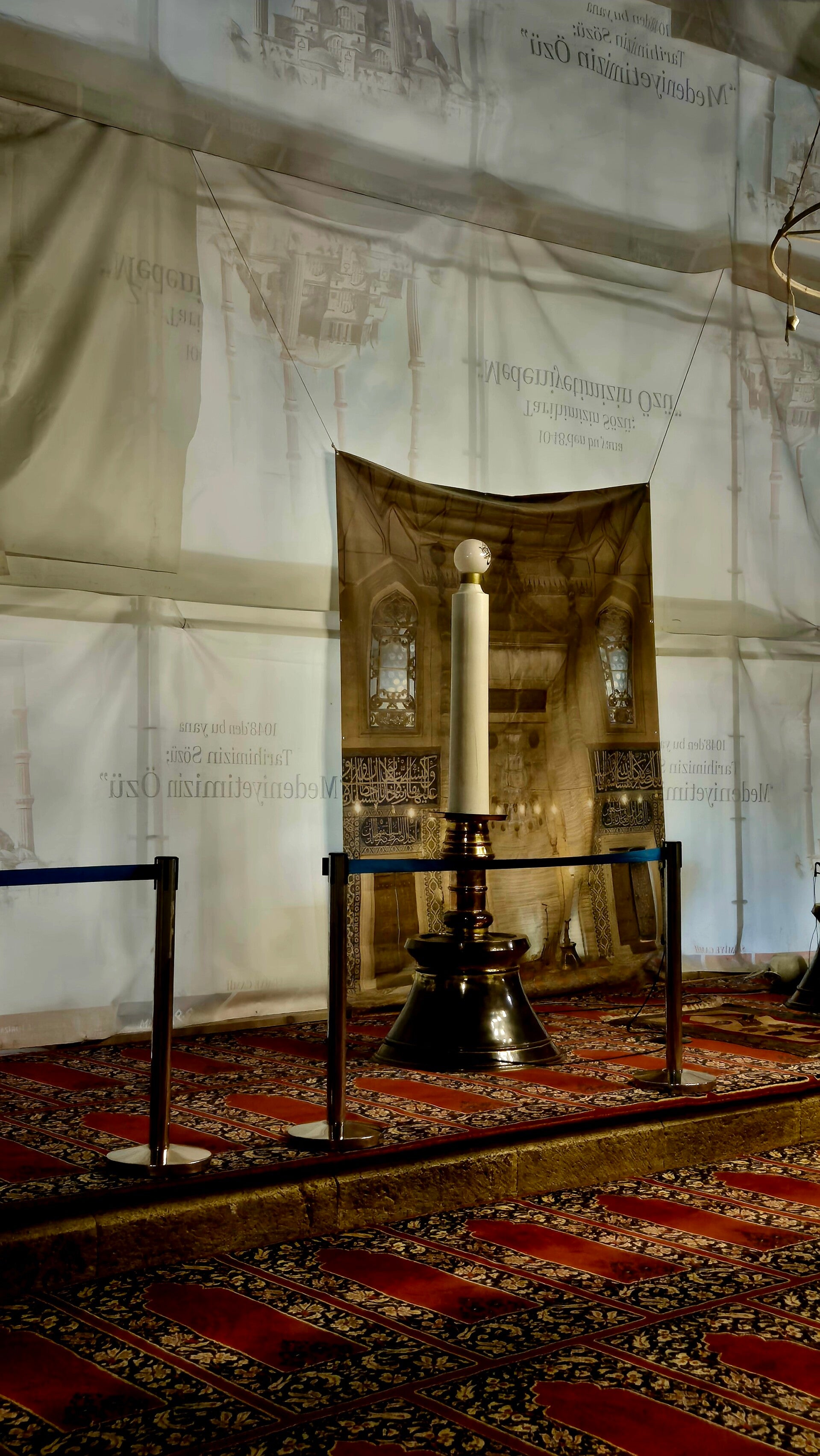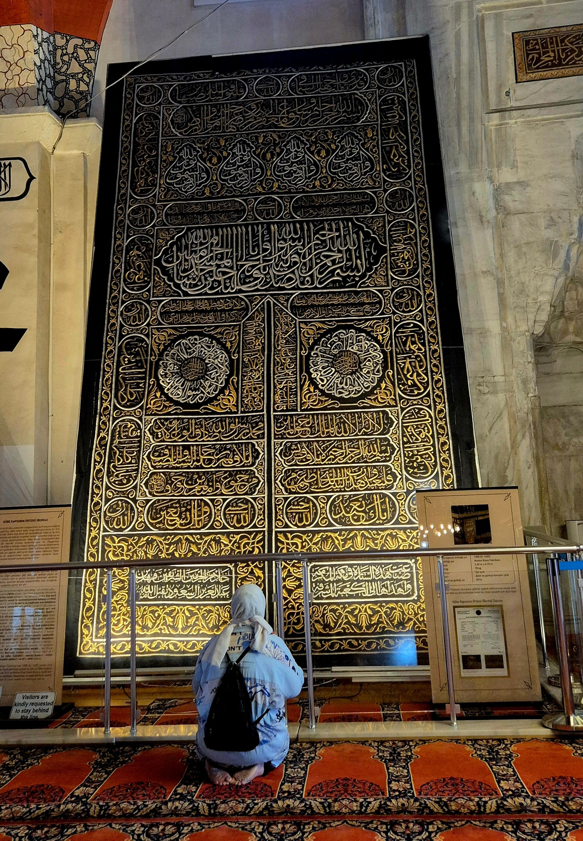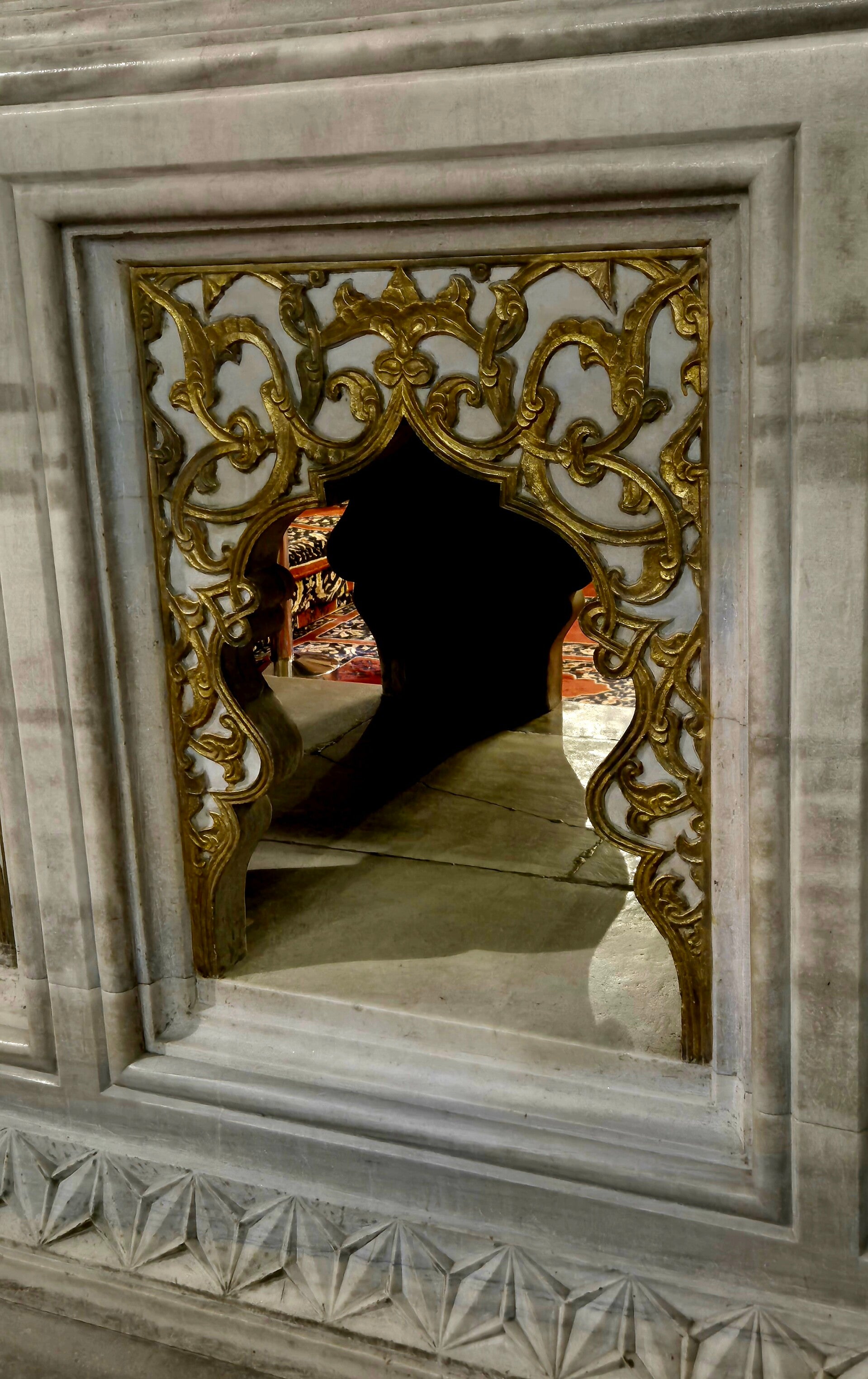 Op de muren staan Arabische spreuken, waaronder het Bismi'lla ir-Rahman ir-Rahiem, waarmee bijna elke soera van de Koran wordt voorafgegaan. Inderdaad klinkt de kreet door de muezzin tijdens ons bezoek als eerste tijdens zijn melodieuze oproep tot gebed, als wij daar rondlopen.