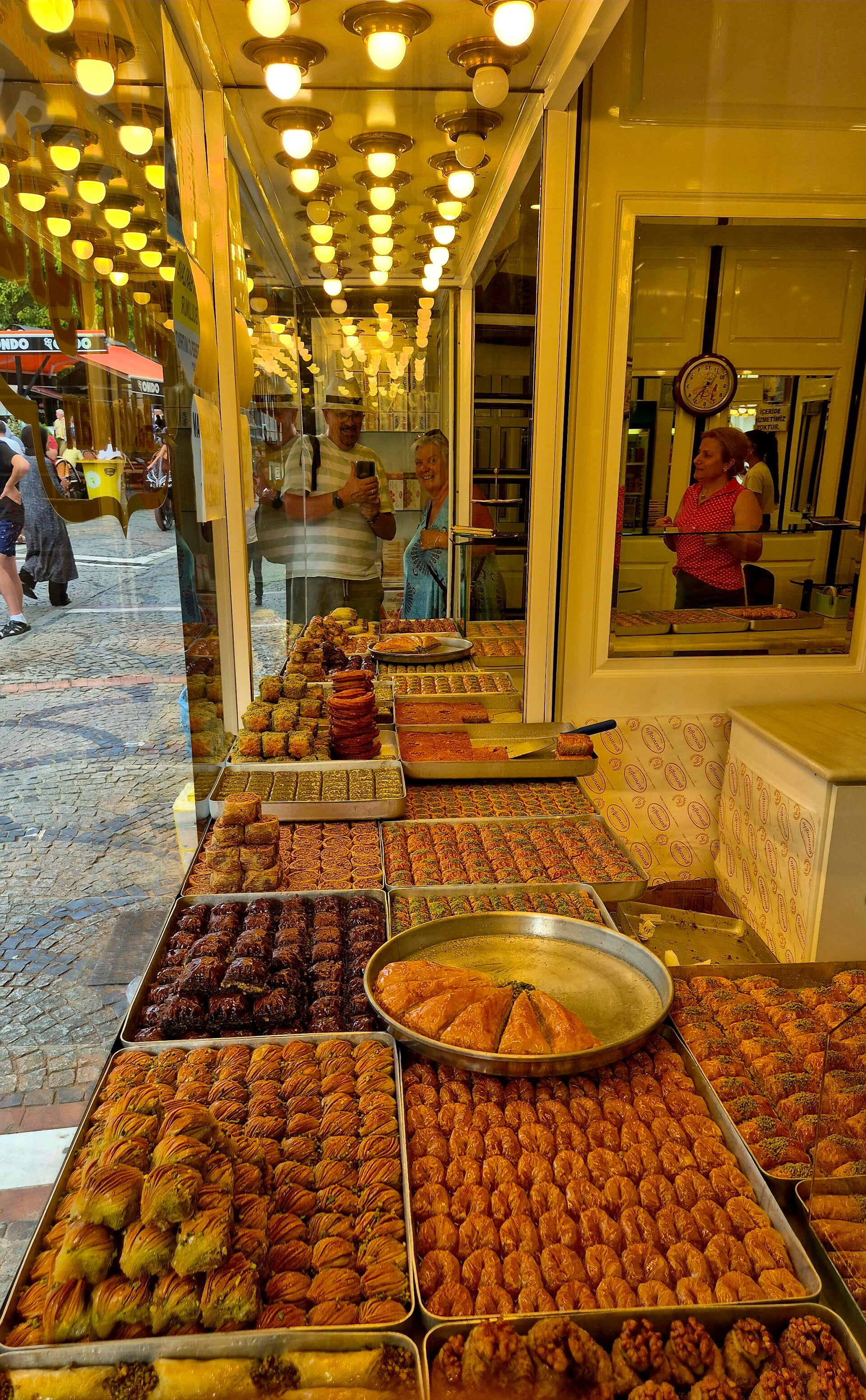 In een winkel met Bakhlava uit Gaziantep, de beste volgens overlevering test ik wat stukjes uit, verrukkelijk. Uiteraard schaf ik wat aan, Marjos vindt ze te zoet. Een straatje verderop ontferm ik mij nog over een lekker schepijsje 🍦😋. De buitentemperatuur bedraagt nog steeds zo'n 33°C als we kalmpjes aan terugwandelen richting camper. De grote Selimiyemoskee is dan al gesloten. Daar nemen we morgenochtend nog een kijkje.