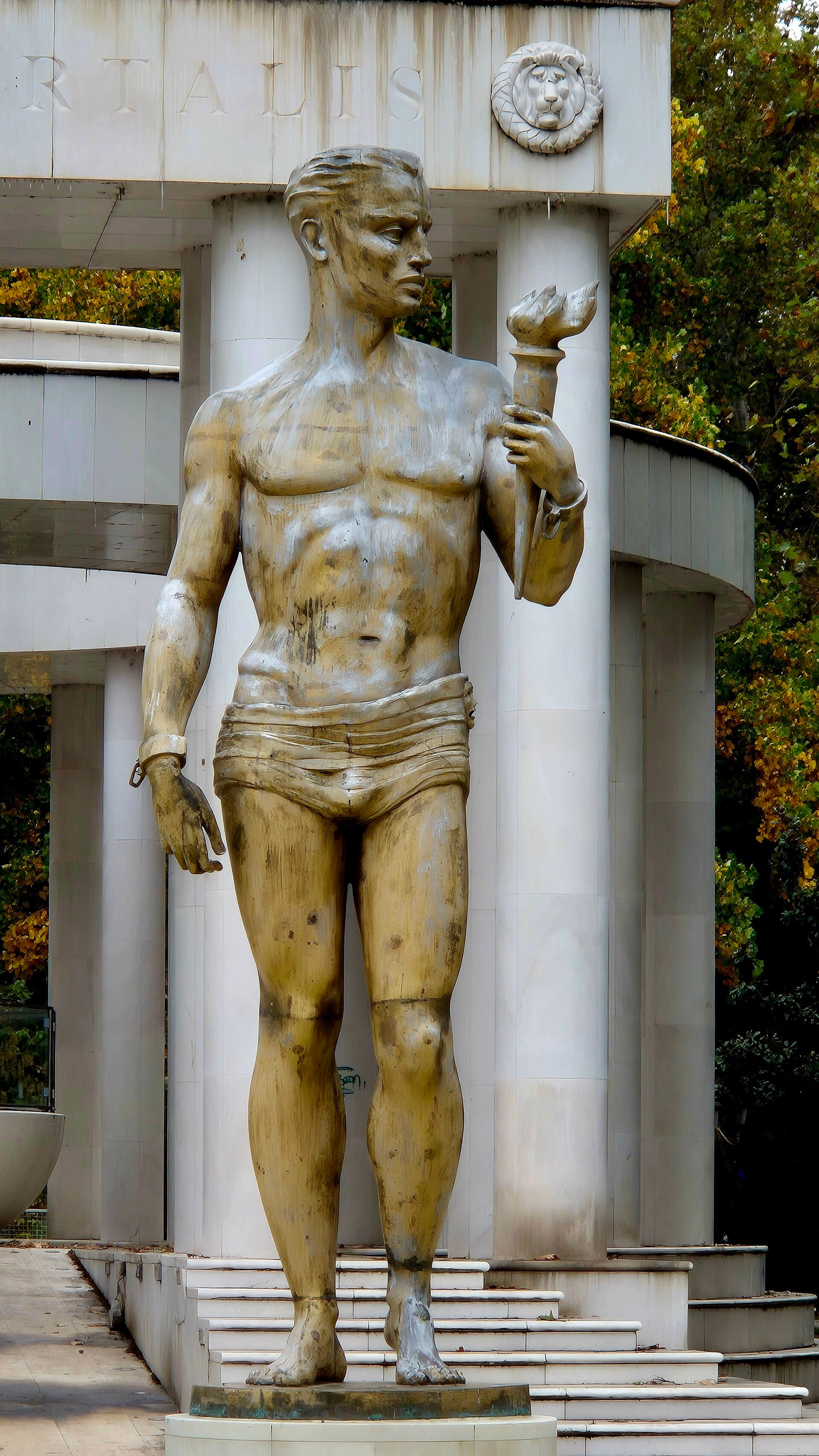 Rond elf uur laten we ons via de Globus-app met een taxi naar het Makedoniaplein brengen. Het punt waar we uitstappen, vlak voor de Makedonia Poort, oogt al veelbelovend. Talloze beelden, beeldengroepen en monumentale standbeelden sieren het park ervoor, mooi.