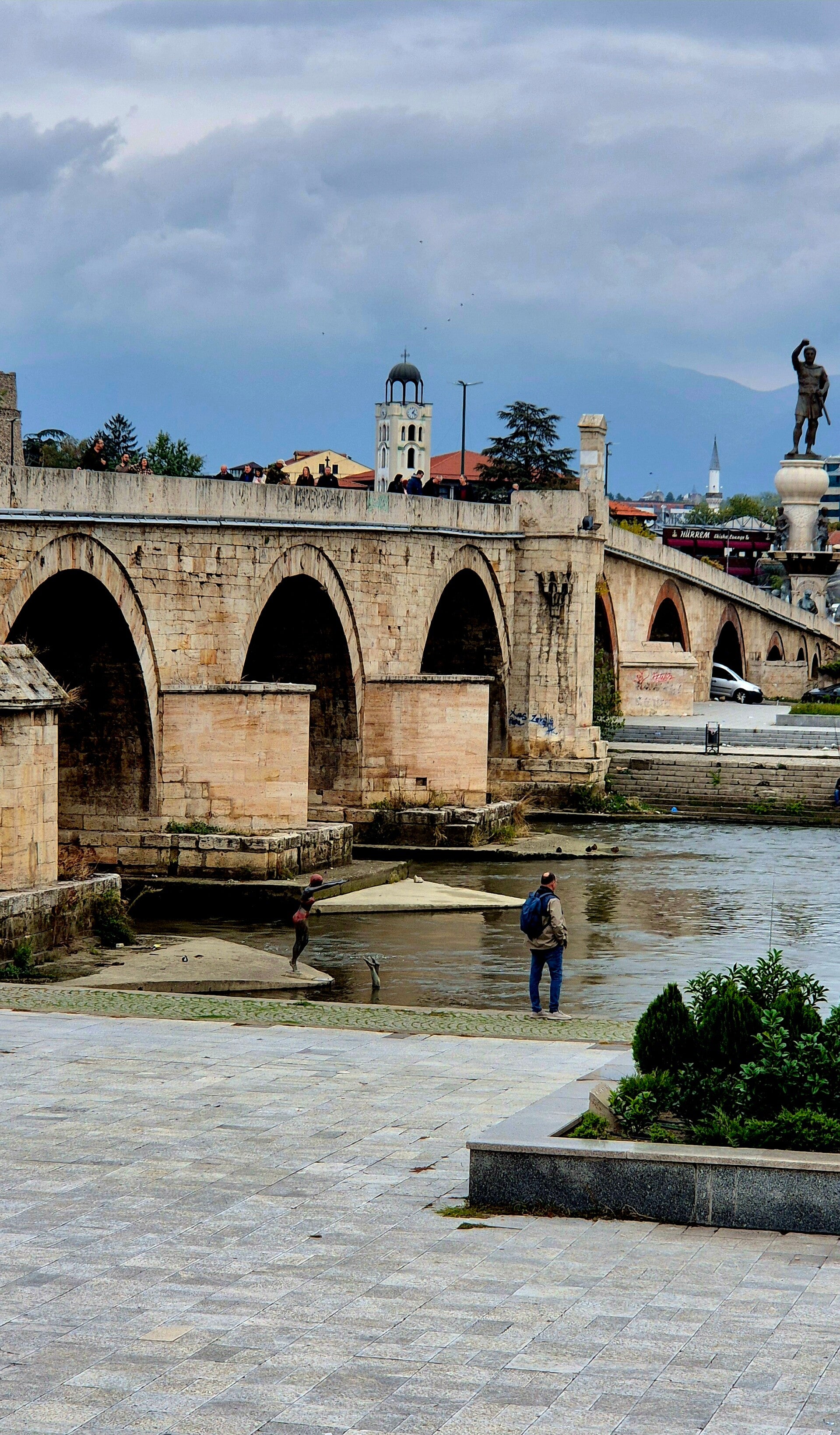 Na een kop koffie wandelen we naar de stenen brug die de rivier de Vardar al sinds de 15e eeuw overspant. Vissers proberen er iets aan de haak te slaan in het snel stromende water. Onderaan één van de brugpijlers staat het beeld van een jonge vrouw die lijkt te willen duiken, een sierlijke toevoeging aan het tafereel. Tussen de vele beeldpartijen door vinden we de ingang van de oude bazaar, het voormalige islamitische deel van de stad.