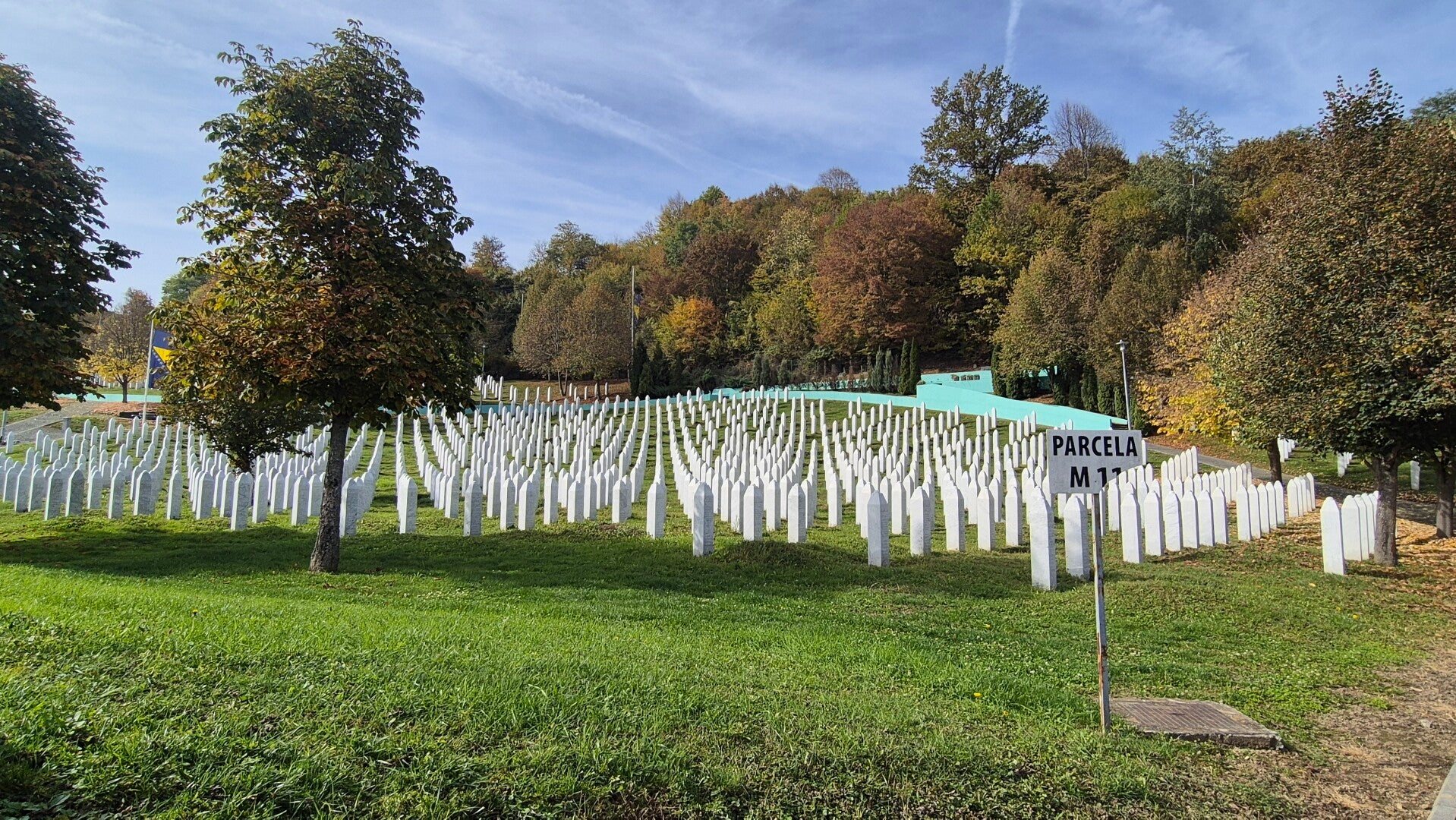 De laatste kilometers naar Potočari, net boven Srebrenica, zijn snel weggereden. Aan de rechterzijde van de weg verschijnt de immense begraafplaats waar de duizenden moslimslachtoffers van de massamoorden uit 1995 begraven liggen.